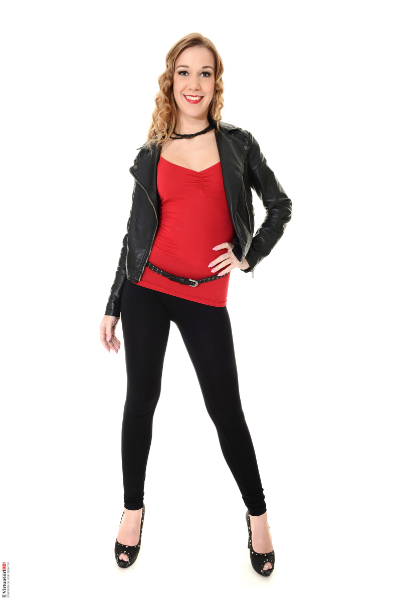 The striptease scene "Blind Date" is about to begin as the incredible Alexis Crystal is rocking a black leather jacket over a red top, a thin studded belt and black leggings. Alexis is teasing her audience with a rock and roll gesture before taking off her jacket and smiling widely at the crowd, ready to take off the rest of her clothes.
