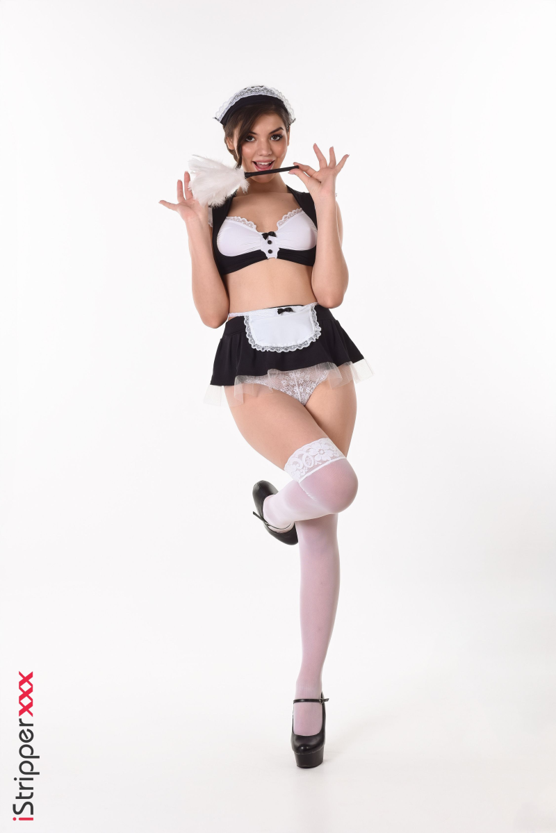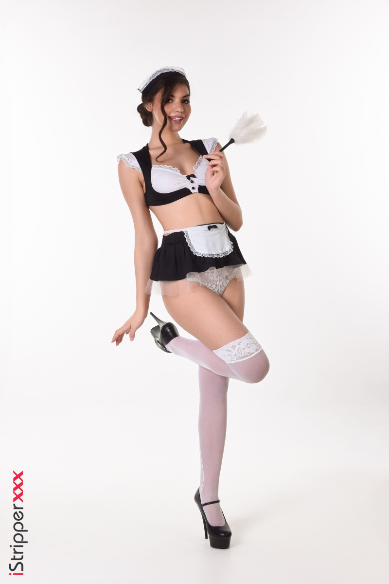 Anna Bella delivers an exciting performance in "Cleaning All The House," starting in a sexy maid costume complete with a feather duster, black bra, and delicate white lace panties. Her elegant white stockings and towering black heels add a touch of glamour as she playfully poses, ready to entice and entertain.