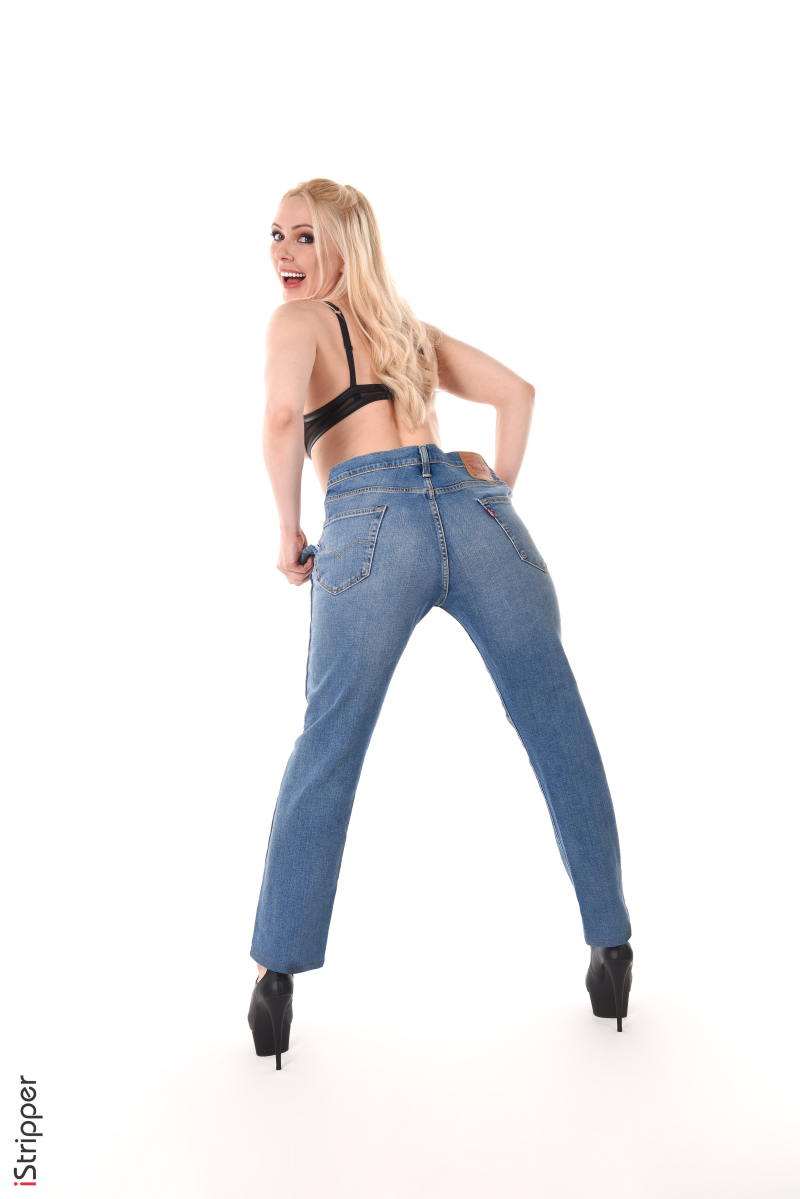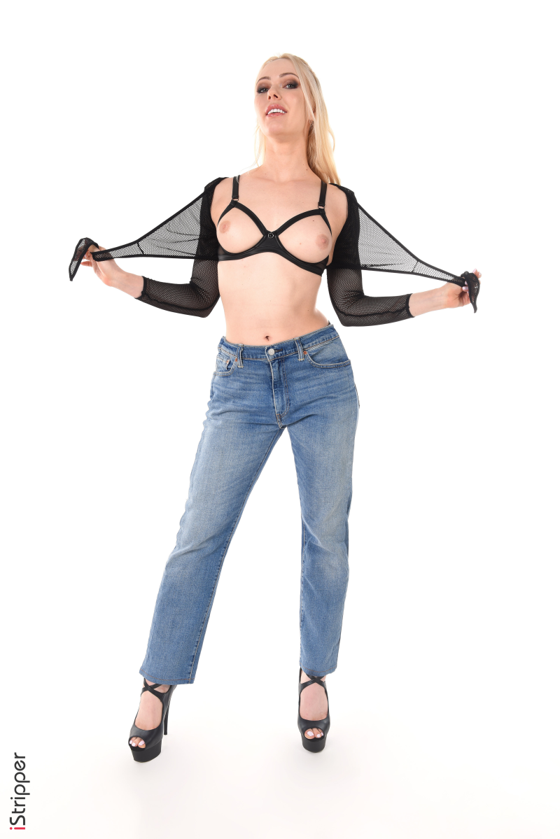 The pictures show the beginning of "Stunner Denim" striptease, Anna Delos is wearing a black see-through top and a blue jeans, posing seductively while slowly starting to undress herself. It is just a glimpse of what she is about to do!