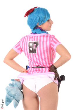The striptease scene "Blue Hot Dragon" features a girl who starts with a playful pink outfit and has a blue wig. During the scene she takes off her clothes piece by piece until she is fully naked and showing all of her curves.