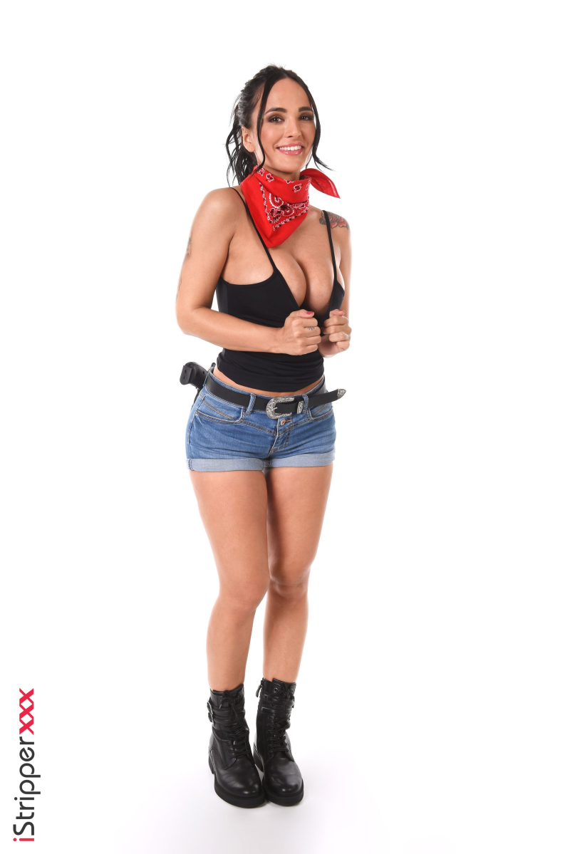 In the "Grand Thick Ass" striptease scene, Claudia Bavel is playing a sexy cowgirl with short jean shorts and a red scarf on her neck while holding a gun and stripping it down. She is trying to be as seductive as possible to seduce the viewer and make him want her even more.