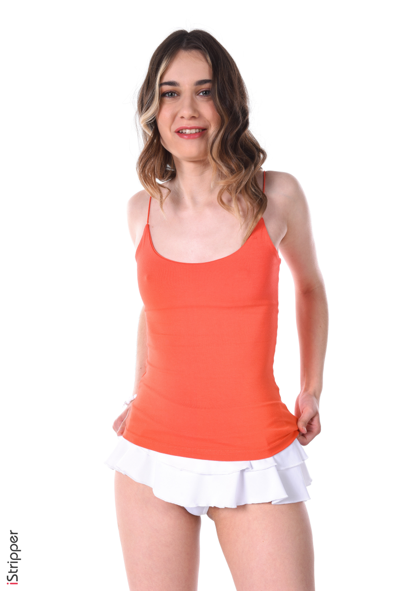 The scene from "Petite Chérie" starts off with Eden Venua posing seductively in a vibrant orange tank top and a playful white mini skirt, teasing with a glimpse of what's to come. As the striptease progresses, she begins to lift the tank top, revealing her toned midriff, while her flirty expression and playful outfit creates an atmosphere of excited anticipation.