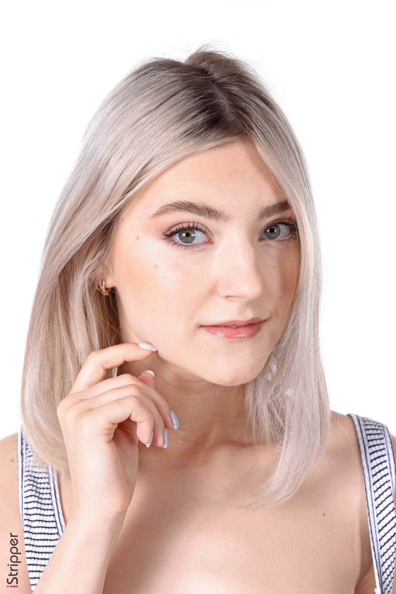 The striptease scene "Overawes" features a blonde hottie named Eva Elfie who starts by wearing a denim skirt and a gray tank top with black platform heels, looking adorable and alluring. She is giving seductive looks to the audience as she prepares to take off her clothes and perform an exciting and naughty dance, while showing off her killer body.