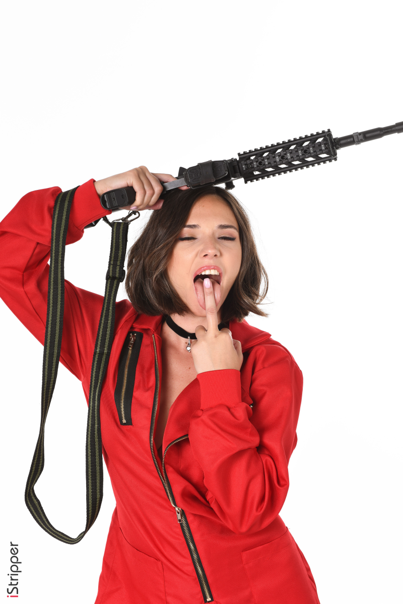 The "Horny Heist" scene presents Eve Sweet in a daring red jumpsuit, unzipped to reveal her inviting cleavage, holding a rifle and a mask. She exudes a playful and provocative energy, licking her finger while posing suggestively with the weapon, making for an exciting display.