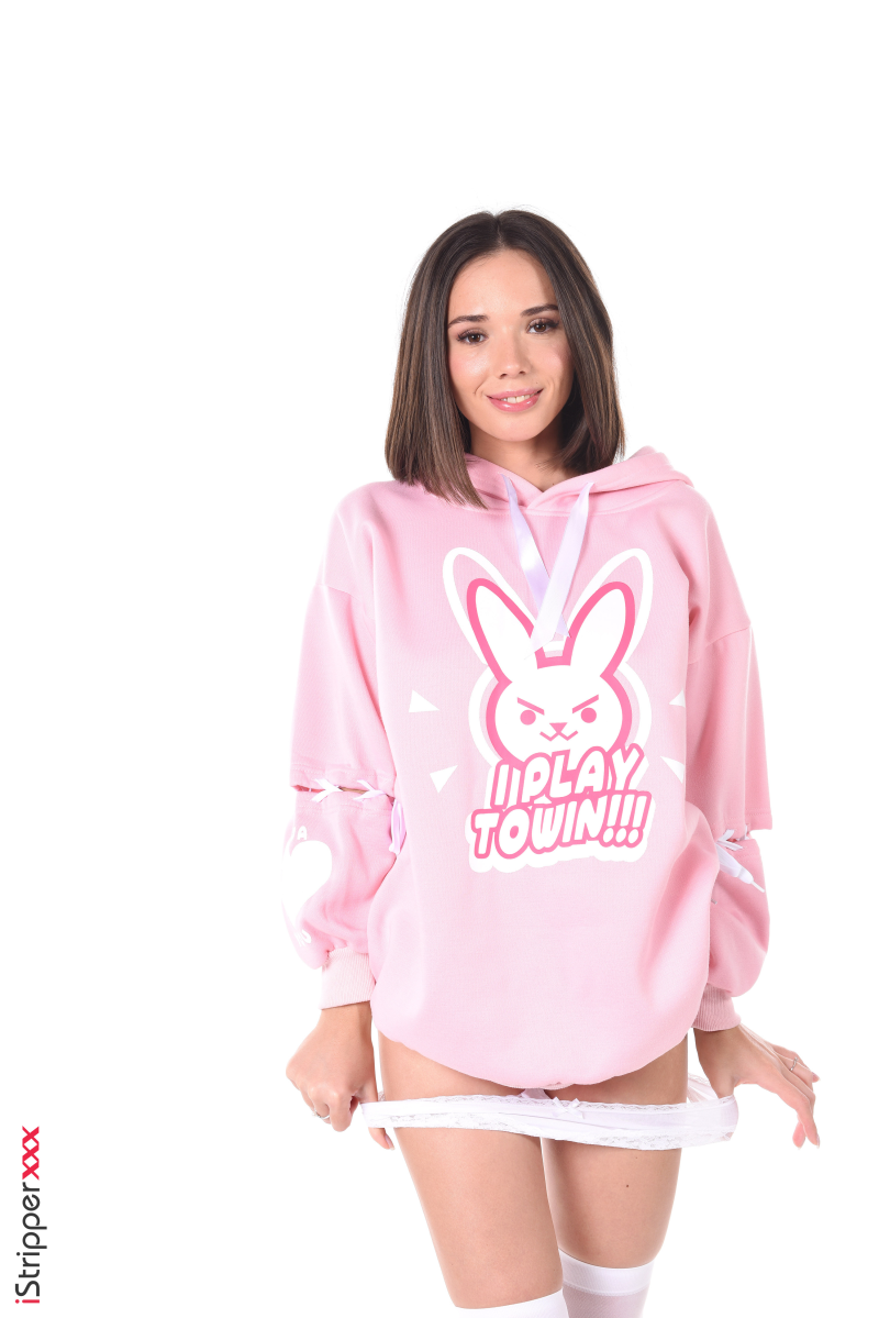 This is the exciting striptease scene "Watch Over Our Diva" where Eve Sweet is wearing a beautiful pink bunny hoodie dress with white thigh highs and some cute mary janes. After some teasing Eve Sweet starts taking off the hoodie dress, now only wearing her white thigh highs and mary janes.