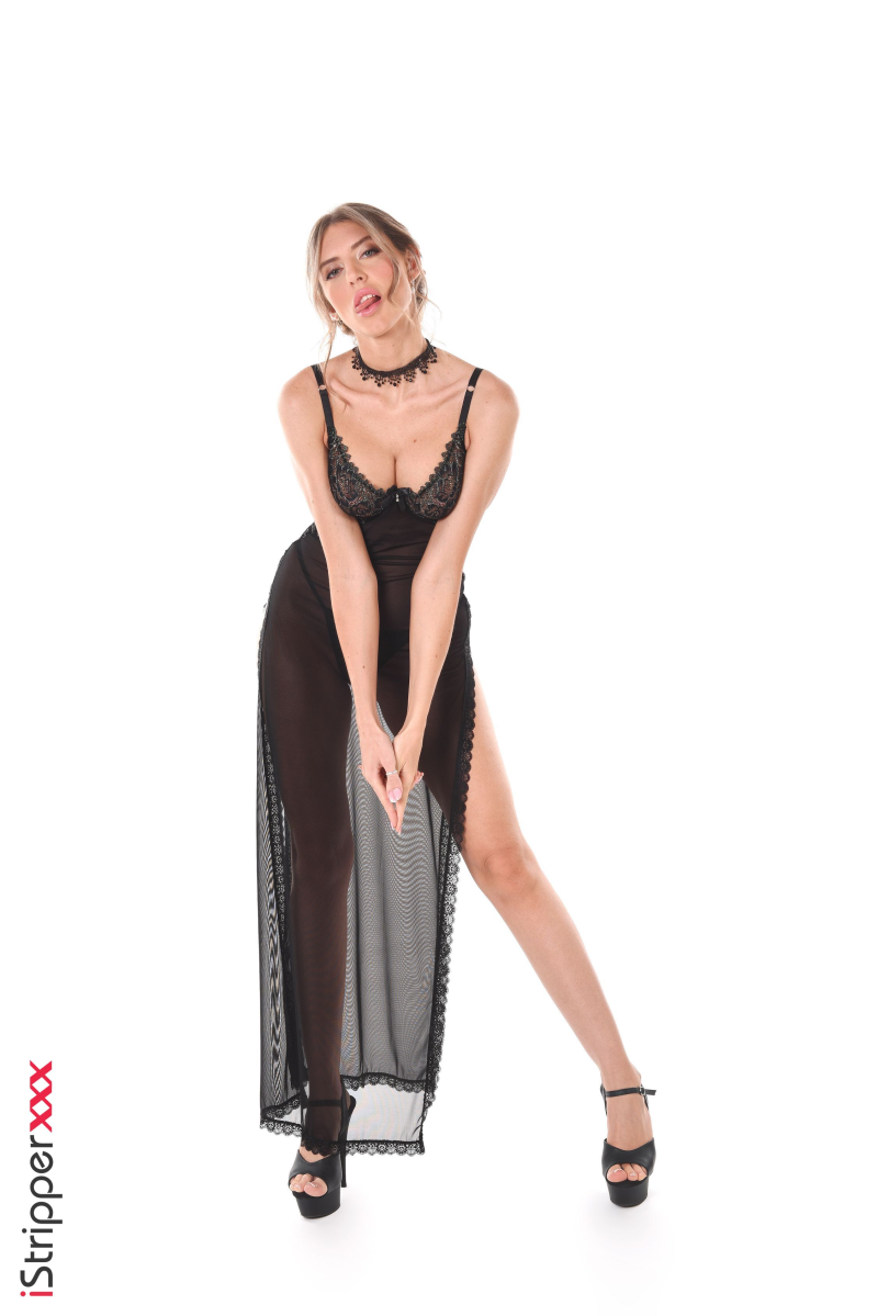 The stripper "Fanta Sie" is slowly removing a long black dress that is revealing her beautiful body, which is driving me crazy in "The Living Fantasy"! She is posing while removing her sexy clothes, and the anticipation is building as she shows off her flawless physique.
