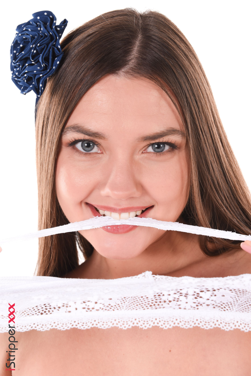 The "Strapless Vibes" striptease scene begins with a girl wearing a blue strapless romper, white high heels, and a blue hair accessory as she dances in a flirtatious manner. Georgia begins to lose her clothes, all while dancing on her high heels, which is incredibly hot!
