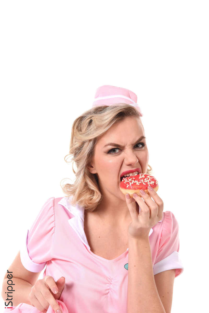 The scene "Serving Up Happy Endings" features Lana Lane in a retro diner waitress outfit, complete with roller skates, ready to tantalize. She is playfully posing with a tray of treats, enticing viewers with her charming smile and suggestive movements as she begins her striptease.
