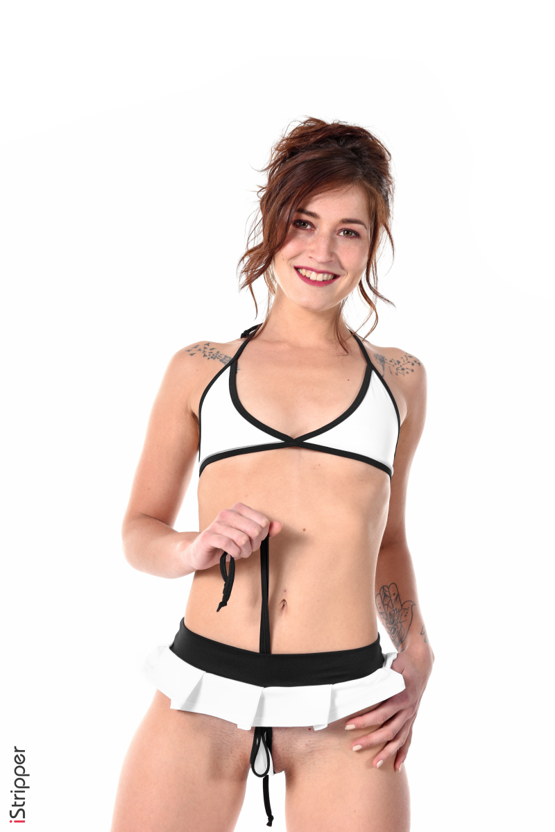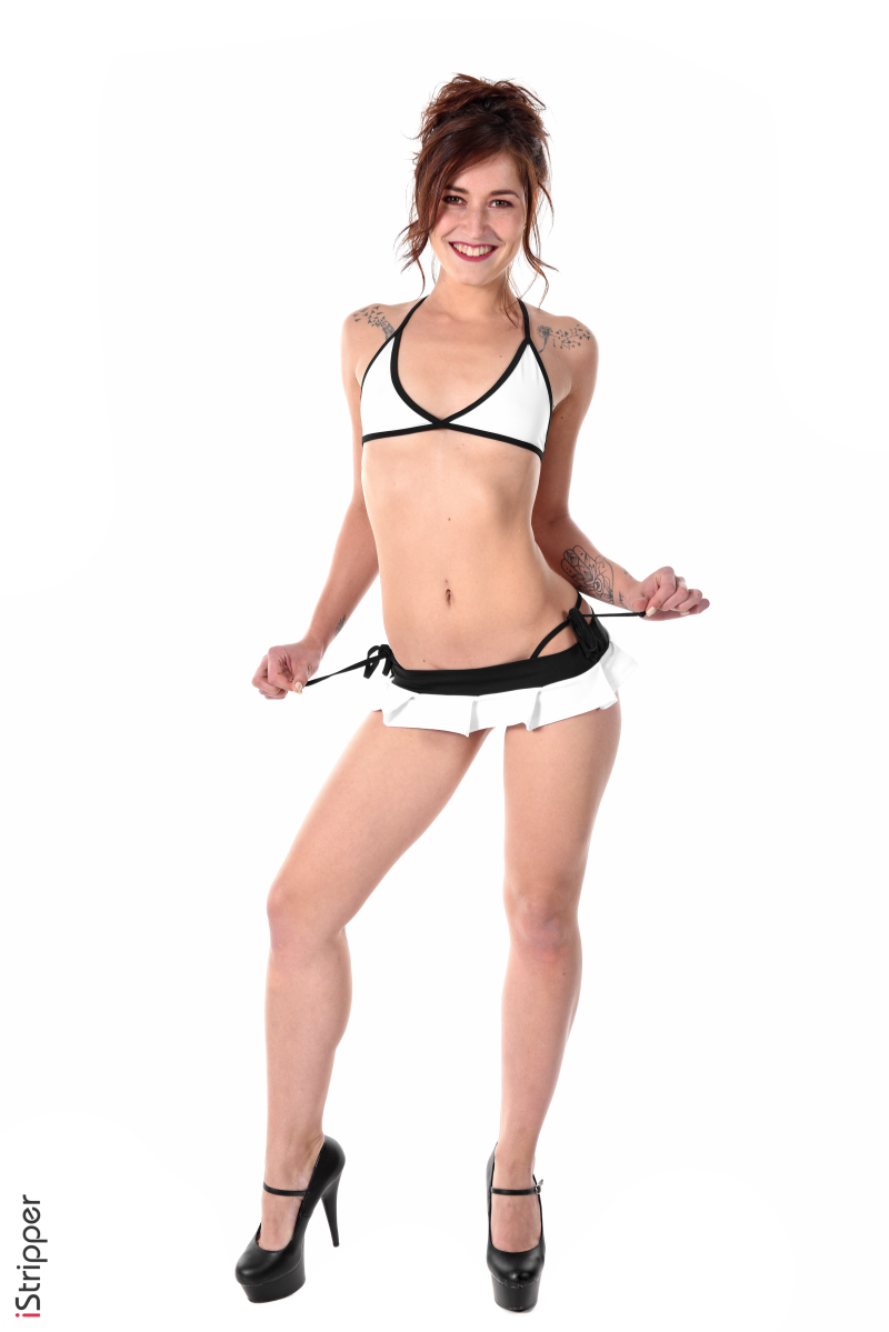 Get ready to be blown away, this is the striptease scene called "Playing the Part" featuring Mina K, she is wearing a white bikini with a mini skirt and holding the skirt string from the bikini, smiling as she looks at you. Now she is showing off her posterior while wearing high heels.