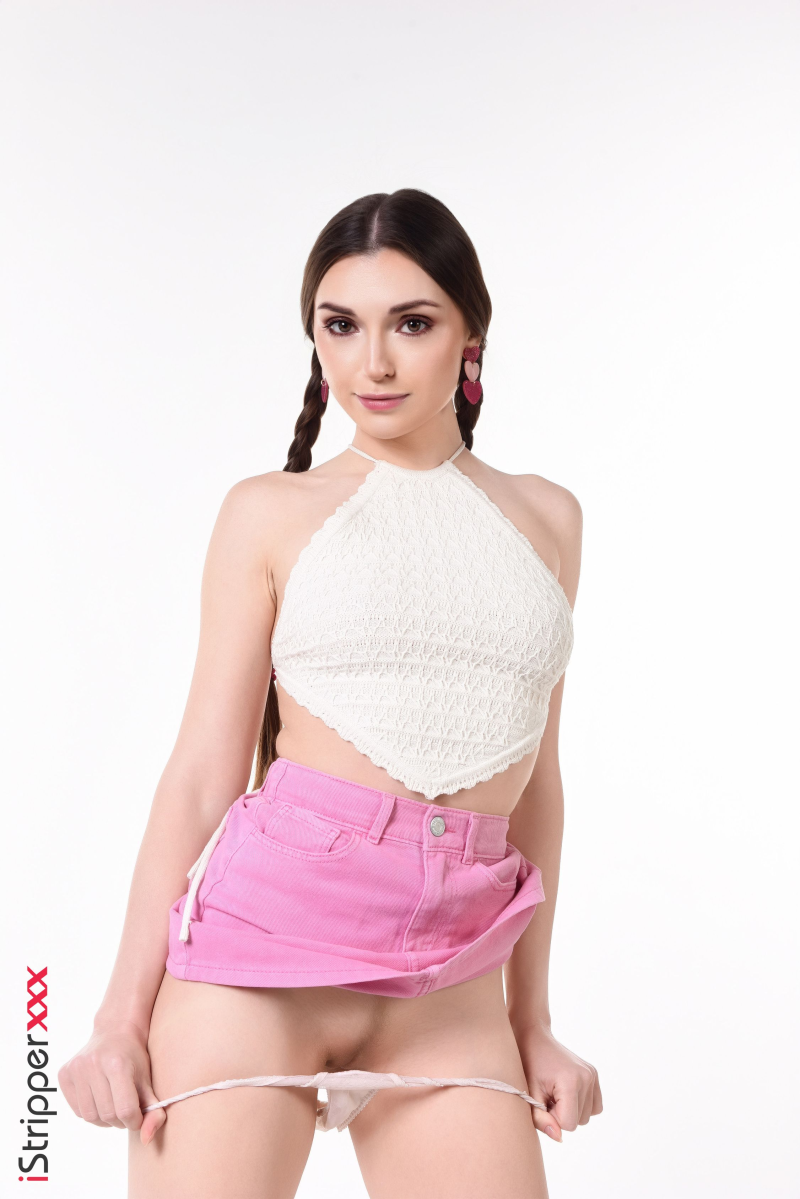 Monika May begins her "Innocent Tourist" striptease looking adorable in a pink skirt and white top, her pigtails adding a playful touch. She's ready to shed her clothes, revealing her lovely body in this exciting performance.