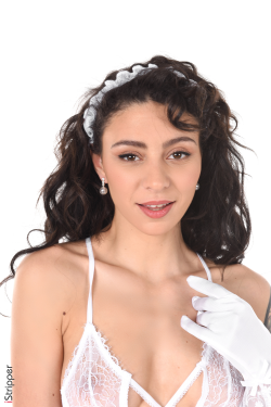 This scene from "The Wait Is Over" shows a sexy Sasha Meow is wearing a see-through white lingerie set with white gloves and high heels and the scene promises to be exciting. The stripper is confidently posing in her outfit, ready to perform a tantalizing dance!