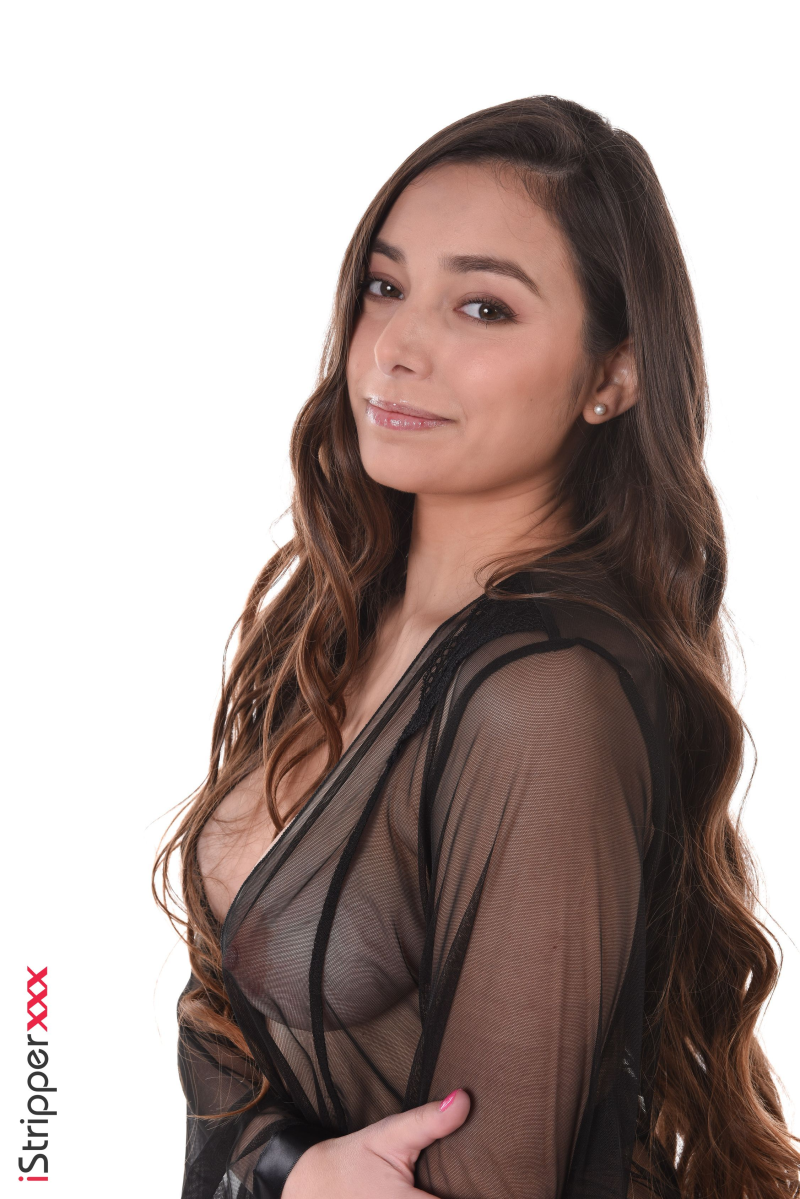 This is exciting! The stripper named Shelena is wearing a sheer robe that ties around the waist with a black piece. In the striptease scene called "See-Thru' Sway" the stripper completes the look with black high heels and long wavy hair as she gives the camera a big smile.