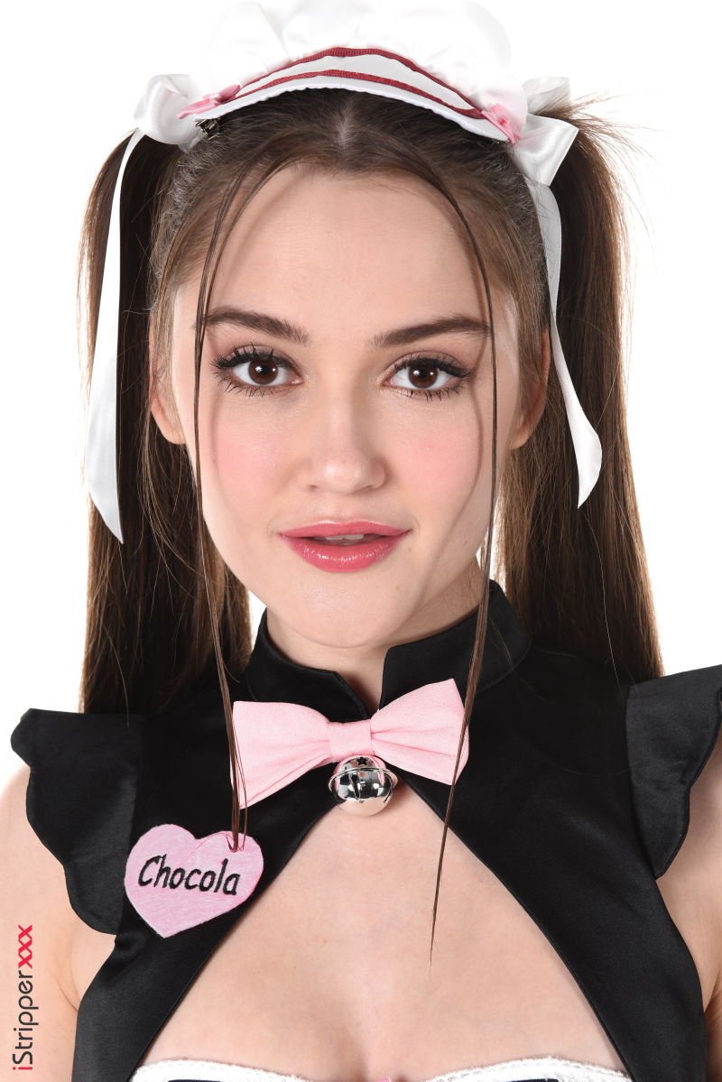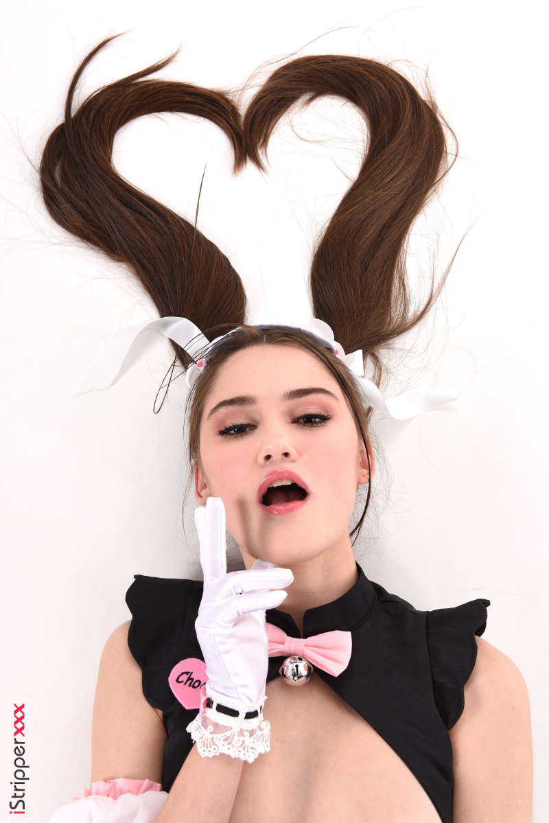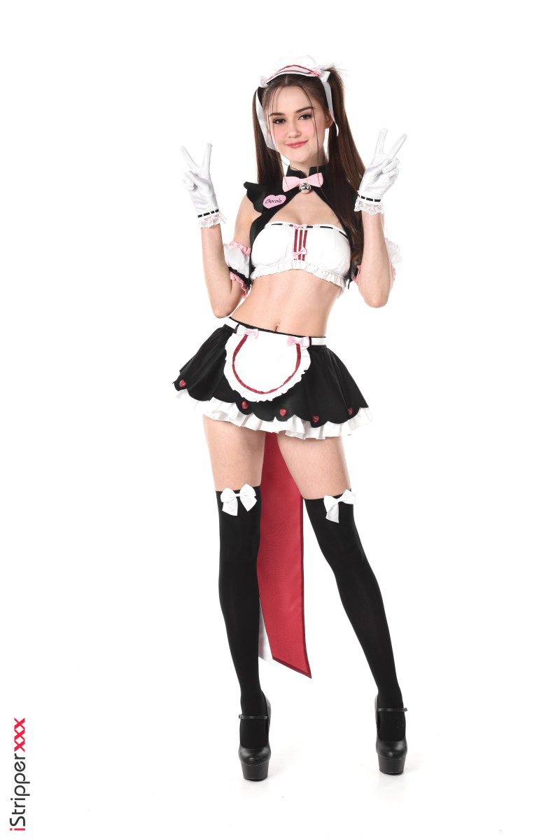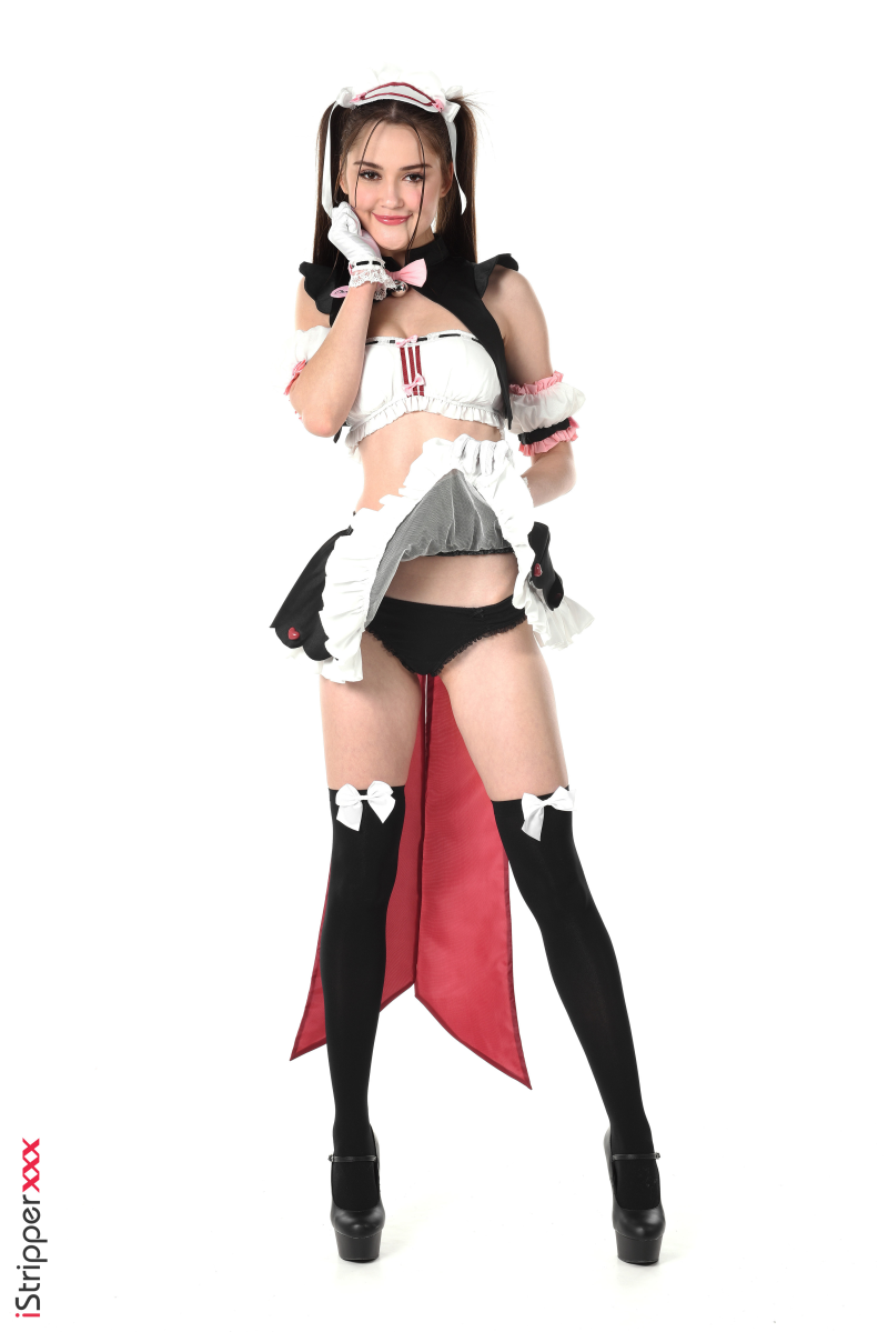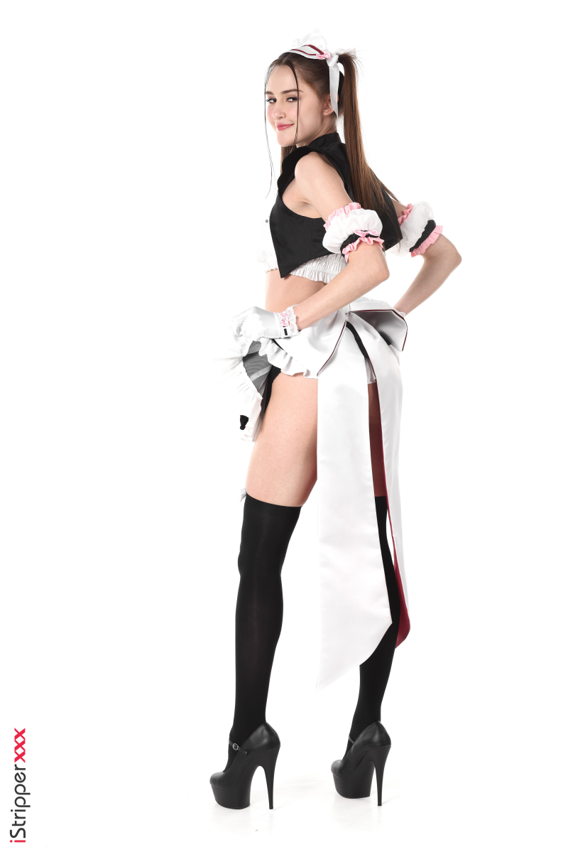 In the "Solo" striptease scene, Sonya Blaze is a playful maid in a cute black and white outfit, looking absolutely adorable as she starts to tease her audience with flirty poses. Her outfit consists of a frilly top, a short skirt, thigh-high socks, and adorable matching gloves, making her look like a sexy anime character.